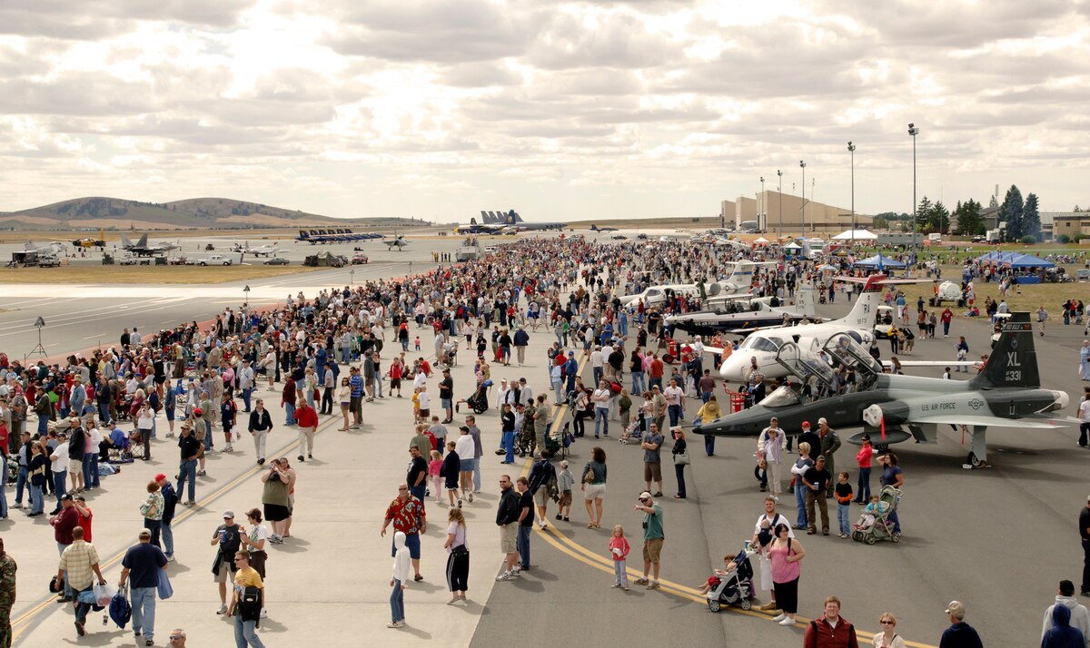 FAIRCHILD AIR FORCE BASE, Wash. – A small crowd watches as the Blue Angels scream toward them in a triangular formation here Aug. 10. The Blue Angels performed precision acrobatics through the Spokane County, Wash., skies during Fairchild’s open house and airshow, Skyfest 2008. (U.S. Air Force photo / Airman 1st Melissa Barnett)