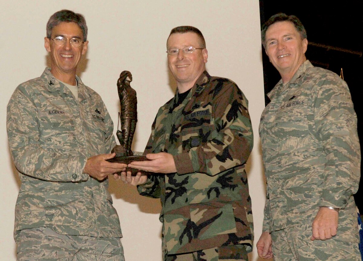 FAIRCHILD AIR FORCE BASE, Wash. – Col. Robert Egbert, 92nd Maintenance commander, and Col. Richard Howard, Air National Guard director of logistics, Andrews Air Force Base, Md., present Capt. Matthew Shovelski, tanker aircraft maintenance unit officer in charge, with the Lt. Gen. Leo Marquez Award here April 17. The Lt. Gen. Leo Marquez Award is presented to maintainers who have demonstrated the highest degree of sustained job performance, job knowledge, job efficiency and results in the categories of aircraft, munitions/missile, and communications-electronics maintenance. It also looks at contributions made to the Air Force at large, the community and self improvement. (U.S. Air Force photo / Airman 1st Class Darlene West)