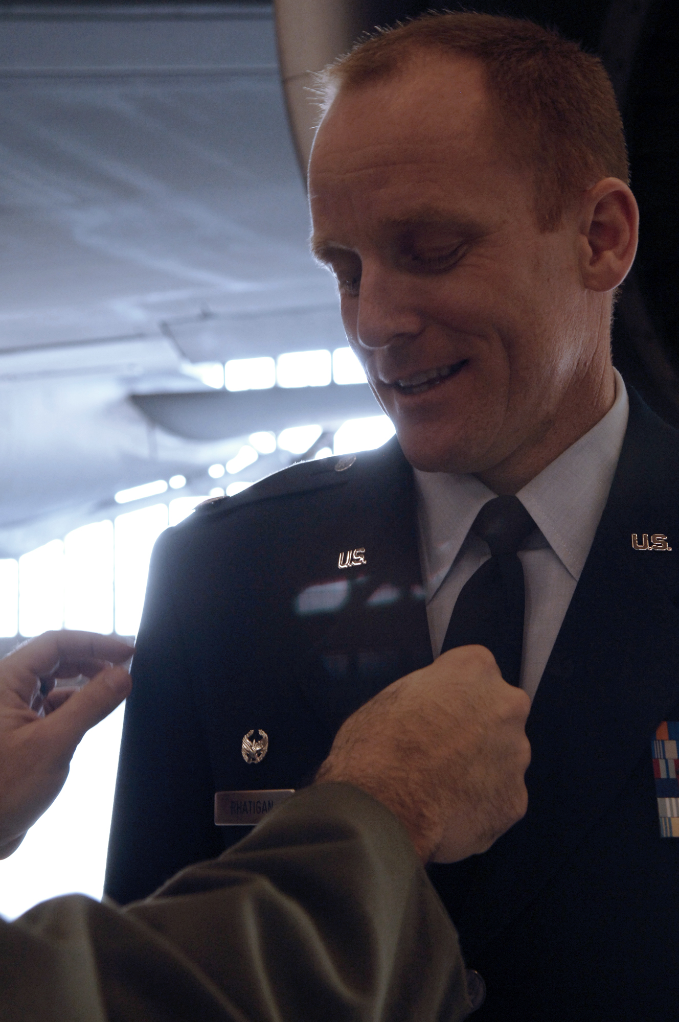 FAIRCHILD AIR FORCE BASE, Wash. – Col. Mark Melville, 92nd Operations Group commander, offers the 93rd Air Refueling Squadron guide-on to Lt. Col. Patrick Rhatigan, new 93rd Air Refueling Squadron commander, during a change-of-command ceremony in Hangar 2050 here March 20. Lt. Col. Patrick Rhatigan is successor to Lt. Col. Glenn LeMasters Jr. (U.S. Air Force photo/Airman 1st Class Darlene West)
