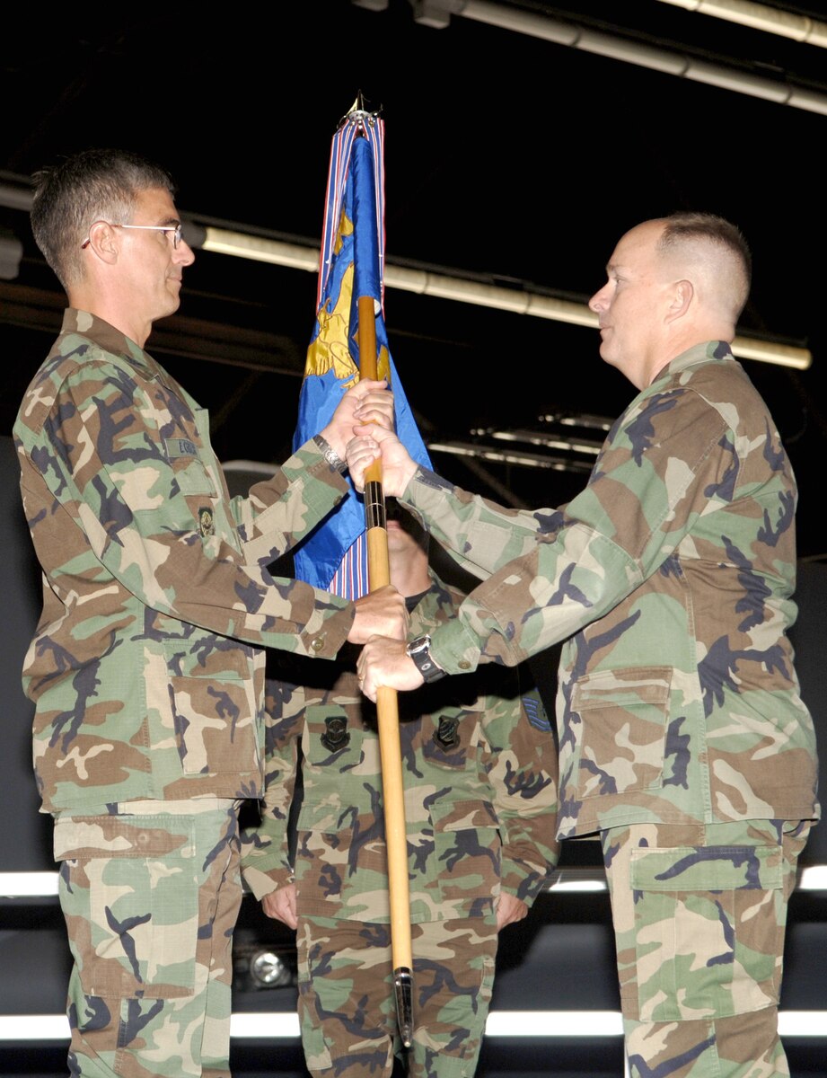 FAIRCHILD AIR FORCE BASE, Wash. – Maj. Robert Moore, the new 92nd Aircraft Maintenance Squadron commander, takes hold of the squadron flag as it is passed to him by Col. Robert Egbert, 92nd Maintenance Group commander, during a change-of command ceremony here Aug. 9. Major Moore assumed command from outgoing squadron commander Lt. Col. David Yockey. (U.S. Air Force photo / Senior Airman Chad Watkins)