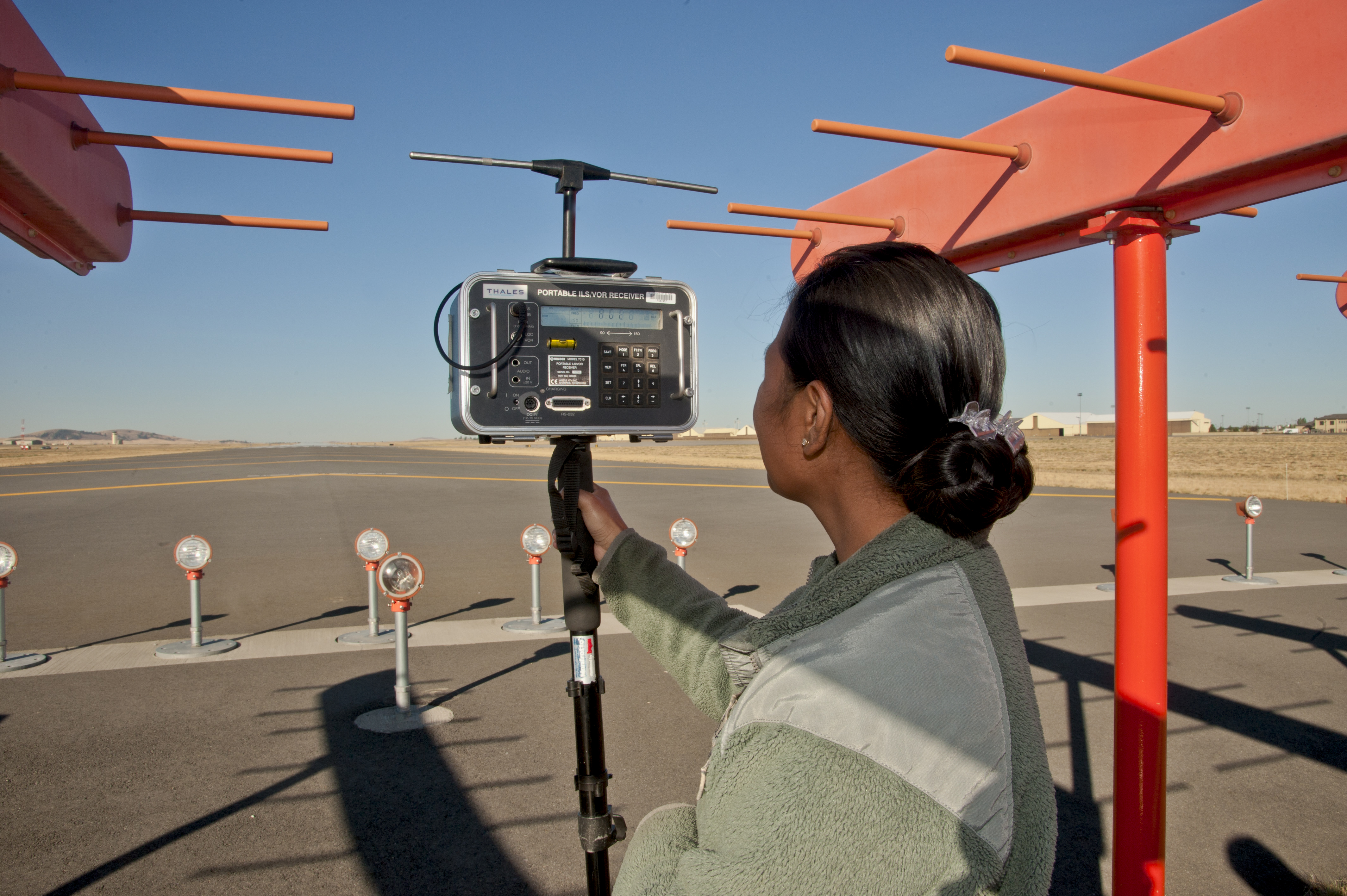 Senior Airman Sida Avila, 92nd Operation Support Squadron airfield systems, measures far field phasing of the glide slope to ensure proper descent angle for landing aircraft Sept. 10, 2015, at Fairchild Air Force Base, Wash. The glide slope is part of the Instrumental Landing System, which is an internationally normalized system for navigation of aircrafts upon the final approach for landing and provides guidance necessary for an accurate landing. (U.S. Air Force photo/Airman 1st Class Taylor Bourgeous)