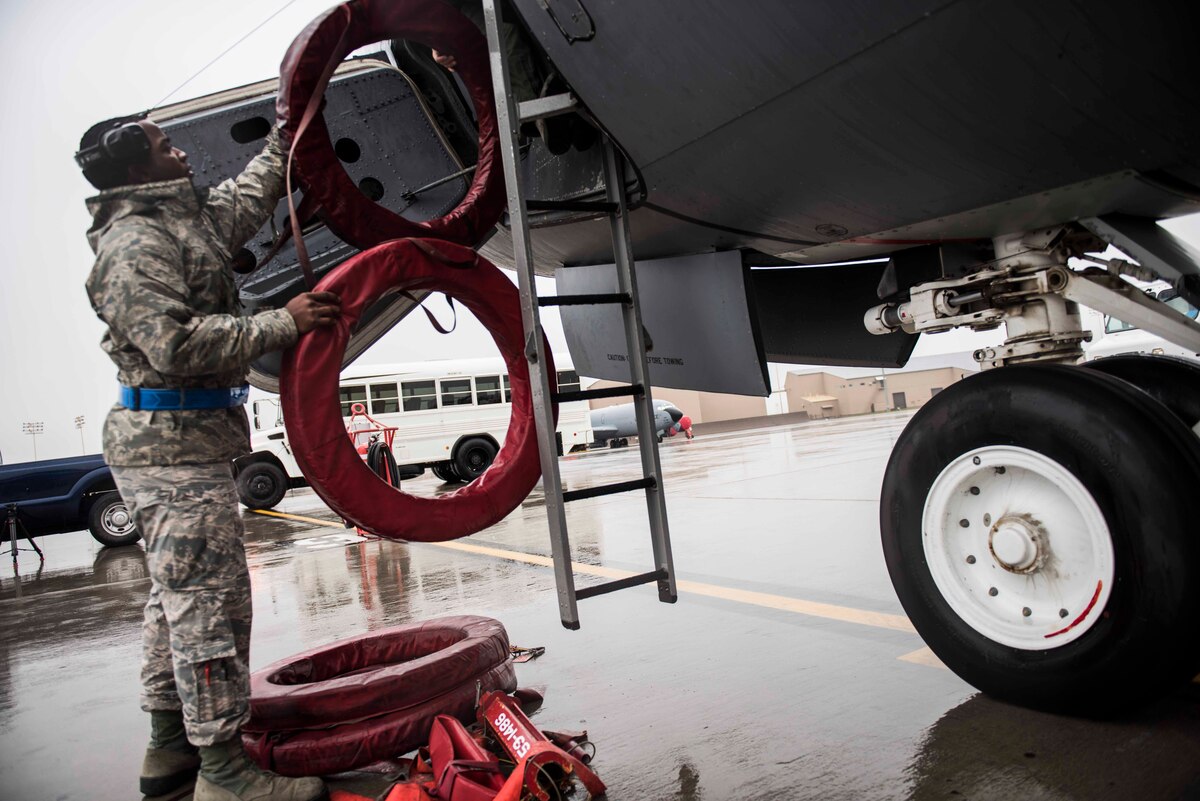 Airman Alvin Carr, 92nd Maintenance Squadron crew chief, hands engine exhaust covers to Capt. Chad Halverstadt, 93rd Air Refueling Squadron pilot, Oct. 27, 2016 at Fairchild Air Force Base, Wash. Flight crew and crew chiefs prepared the KC-135R Stratotanker to execute wing's air refueling mission at a moment's notice. (U.S. Air Force photo/Senior Airman Nick J. Daniello)