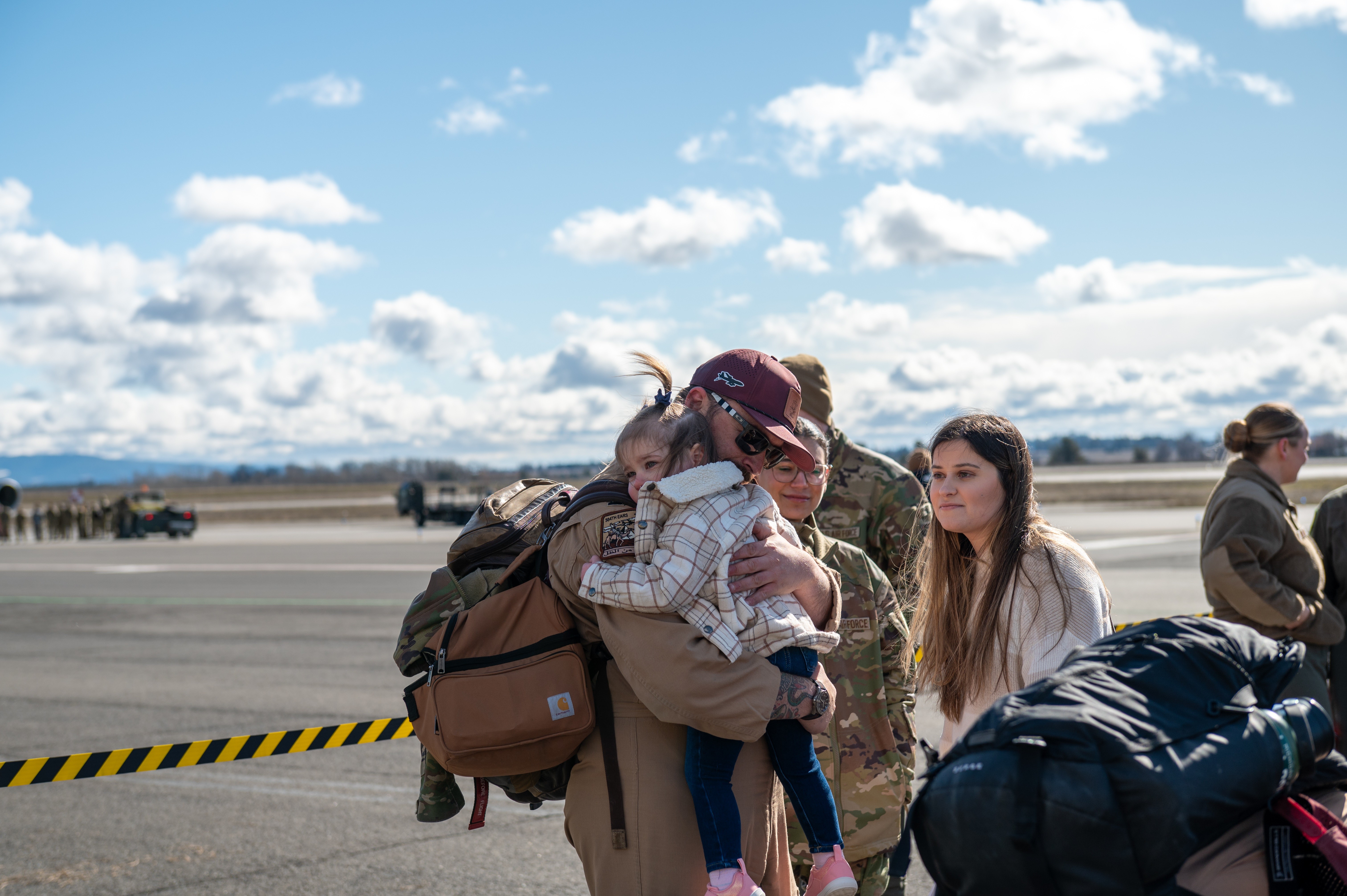 A member of the 92nd Air Refueling Wing, holds his daughter after returning home from deployment at Fairchild Air Force Base, Washington, March 18, 2026. Airmen assigned to the 92nd ARW returned home after being deployed. (U.S. Air Force photo by Airman 1st Class Gabriel Conley)