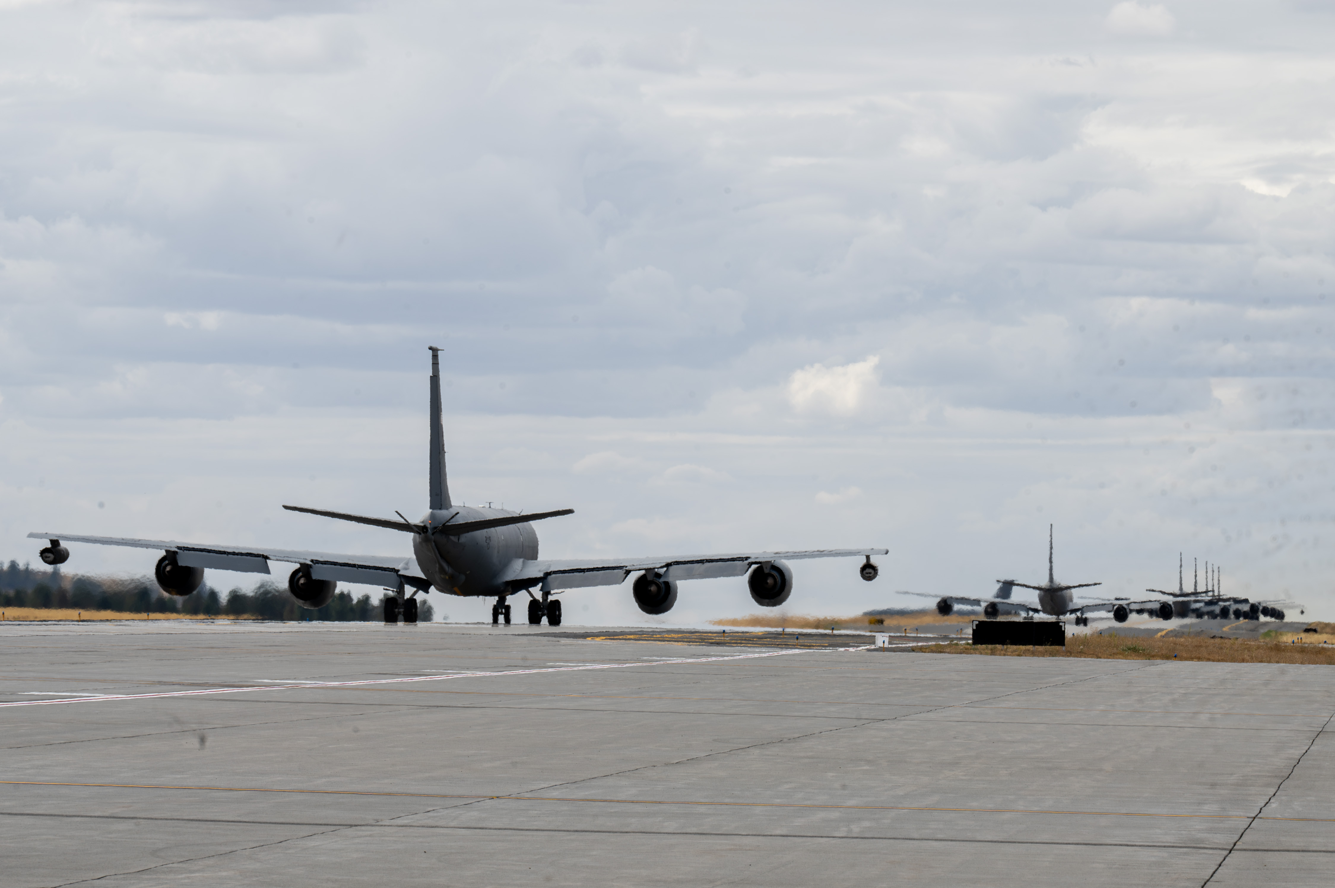 KC-135 Stratotankers assigned to the 92nd Air Refueling Wing taxis during exercise Titan Fury 24-7 at Fairchild AFB, Washington, Sept. 11, 2024. During the exercise, Airmen were graded on their ability to rapidly respond at a moment’s notice. Titan Fury is a recurring total force exercise that ensures Fairchild’s Airmen are trained and ready to provide Rapid Global Mobility at a moment’s notice in support of strategic deterrence and the National Defense Strategy. This exercise is an example of how the 92nd ARW is engaged, postured and ready with a credible force to assure, deter and defend in an increasingly complex security environment. (U.S. Air Force photo by Airman 1st Class Megan Delaine)
