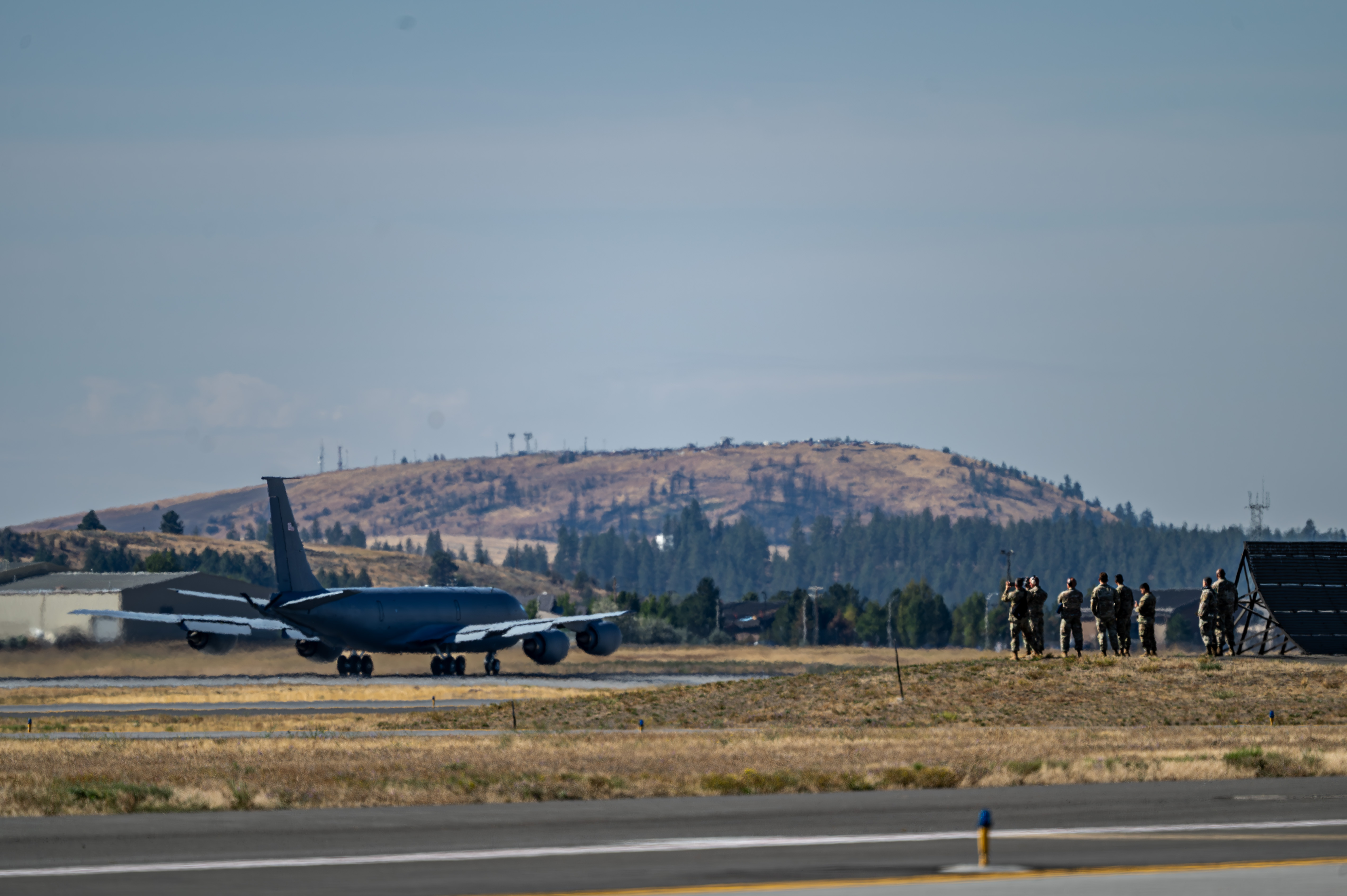 A KC-135 Stratotanker assigned to the 92nd Air Refueling Wing taxis during exercise Titan Fury 24-7 at Fairchild Air Force Base, Washington, Sept. 11, 2024. During the exercise, Airmen were graded on their ability to rapidly respond at a moment’s notice. Titan Fury is a recurring total force exercise that ensures Fairchild’s Airmen are trained and ready to provide Rapid Global Mobility at a moment’s notice in support of strategic deterrence and the National Defense Strategy. This exercise is an example of how the 92nd ARW is engaged, postured and ready with a credible force to assure, deter and defend in an increasingly complex security environment. (U.S. Air Force photo by Airman 1st Class Megan Delaine)