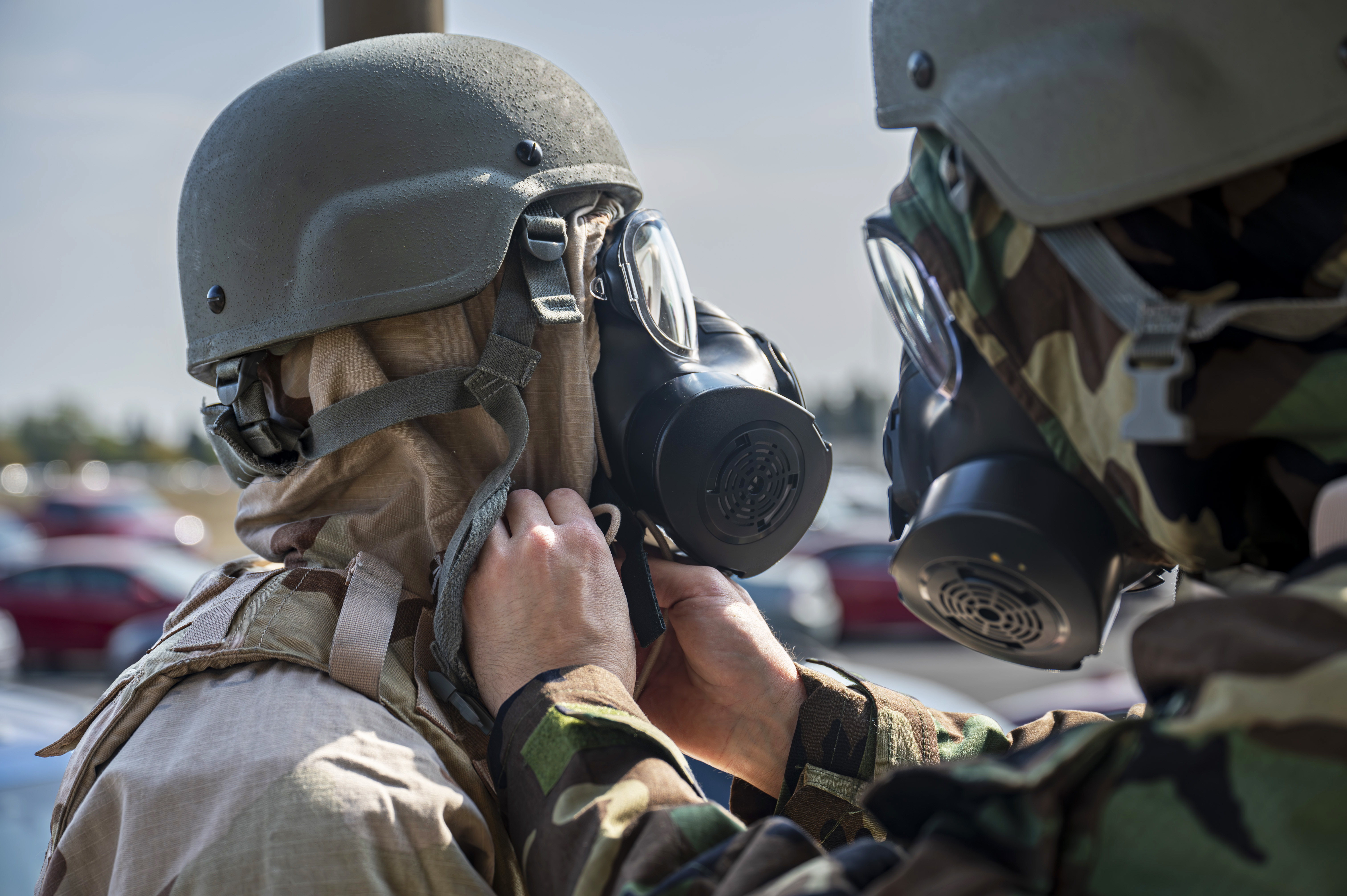 Staff Sgt. Bryton Carrington, left, and Airman 1st Class Danyelle Carswell, defenders assigned to the 92nd Security Forces Squadron, learn about the use of gas masks in their mission-oriented protective posture gear at Fairchild Air Force Base, Washington, Sept. 3, 2024. The class teaches Airmen how to properly don MOPP gear, which is designed to protect against chemical, biological, radiological and nuclear threats. Airmen are required to complete classes such as CBRN to meet deployment readiness requirements. (U.S. Air Force photo by Airman 1st Class Megan Delaine)