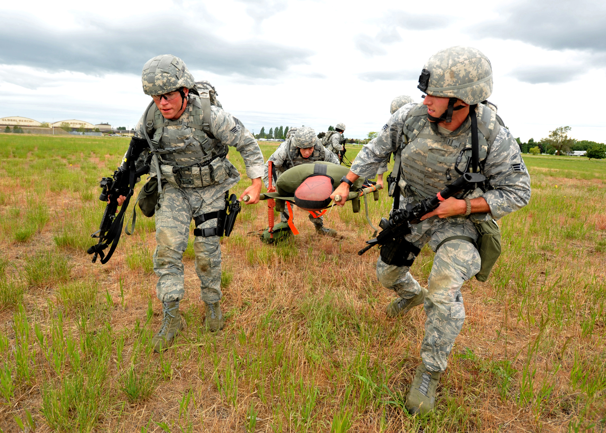 FAIRCHILD AIR FORCE BASE, Wash. -- Members of the 92nd Security Forces Squadron Rodeo team carry a life-sized dummy on a litter in a training exercise here, June 16, 2011. The training course incorporates multiple tasks that could be used in a tactical environment. The Airmen are training for Air Mobility Command Rodeo where they will compete in a course in which they have to practice field craft scenarios for added difficulty. (U.S. Air Force photo / Staff Sgt. Michael Means/Released)