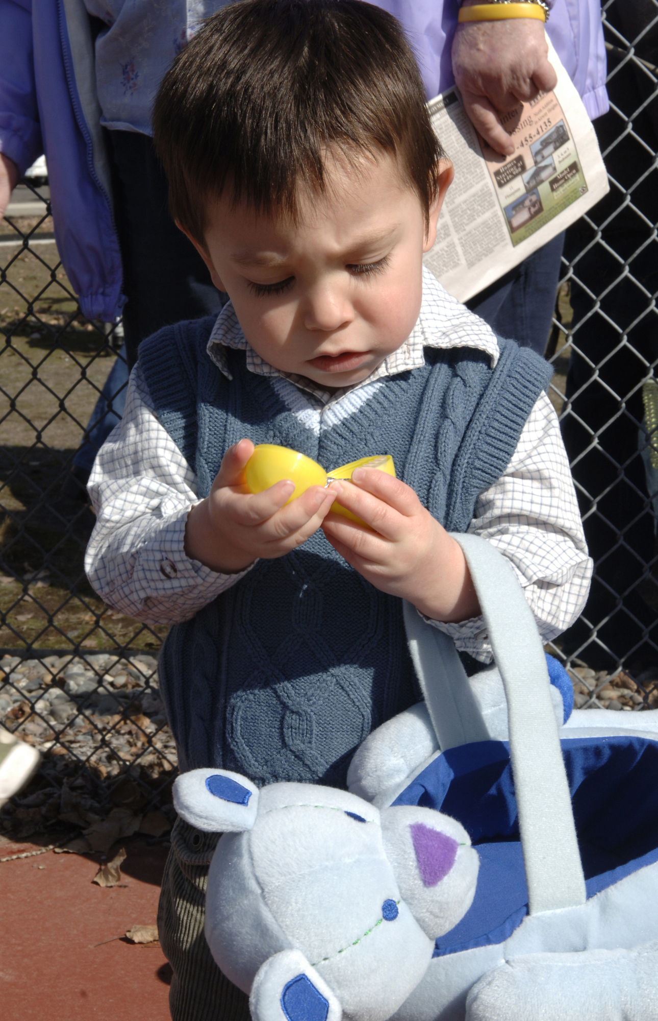 FAIRCHILD AIR FORCE BASE, Wash. – Bradley West, 2, opens an Easter egg during the Annual Children’s Easter Egg Hunt March 22. The multicolored plastic Easter eggs were filled with candy and spread across the tennis court for children to pick up. (U.S. Air Force photo / Airman 1st Class Darlene West)