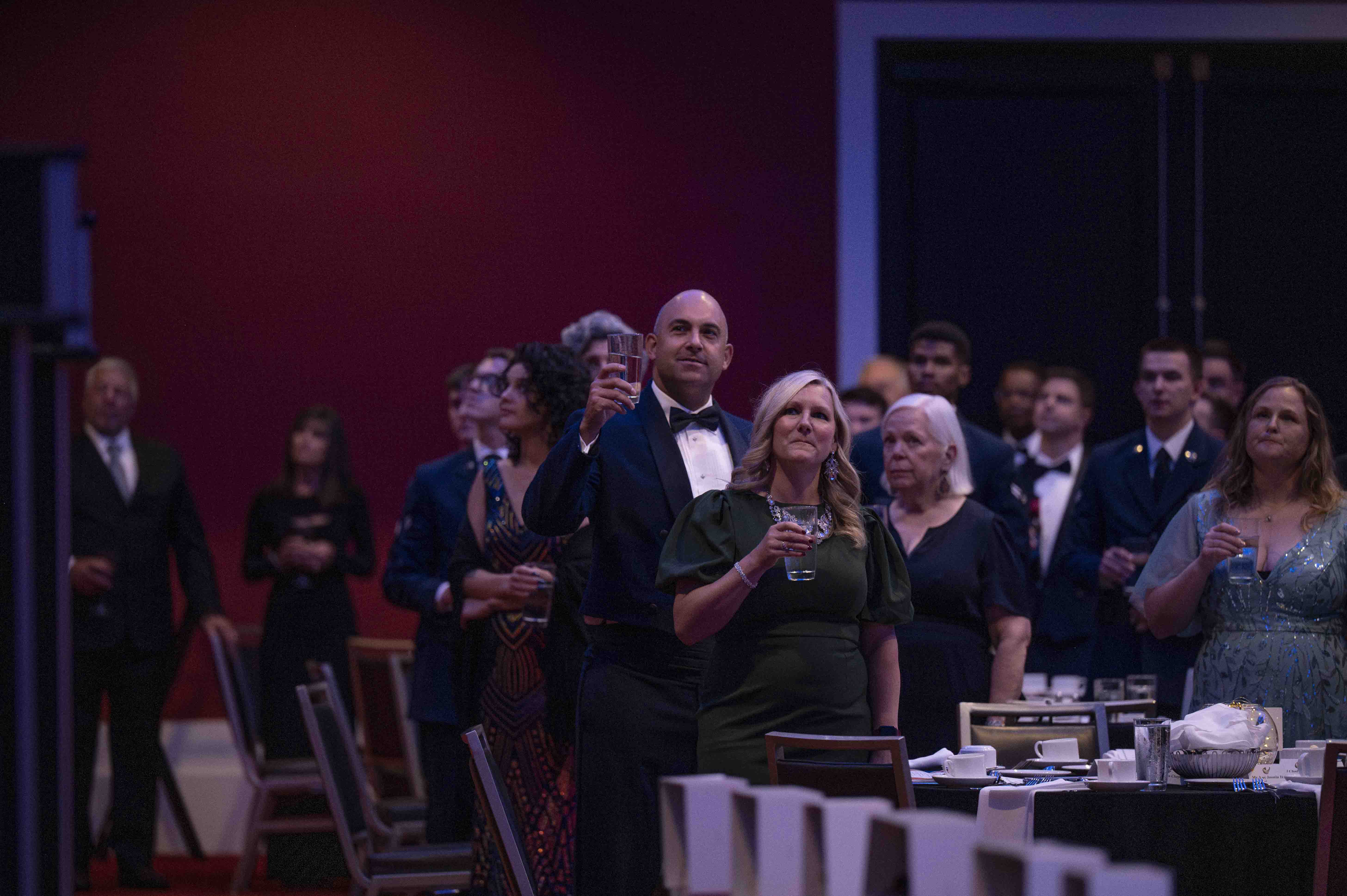 Attendees raise their glass during the Fairchild Air Force Ball at the Davenport Grand Hotel in Spokane, Washington, Sept. 18, 2025. Attendees raised their glass during the toast in honor of the service of Airmen past and present. (U.S. Air Force photo by Airman Emilee Seiler)
