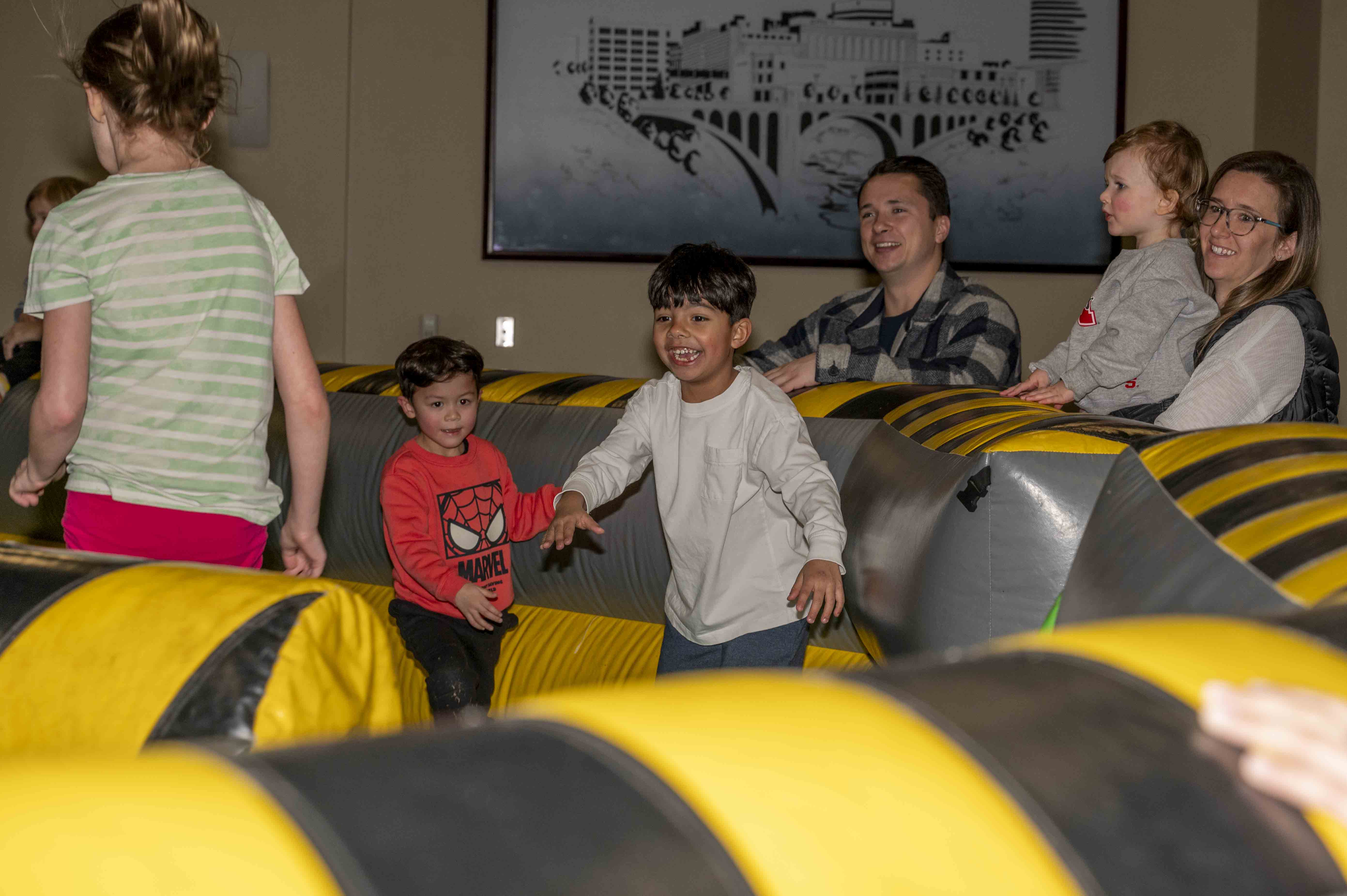 Military children play on an inflatable during Winterfest at Fairchild Air Force Base, Washington, Feb. 7, 2026. Winterfest is an annual event that invites Airmen, families and friends to celebrate the winter season and enjoy food, drink and activities. (U.S. Air Force photo by Airman 1st Class Emilee Seiler)